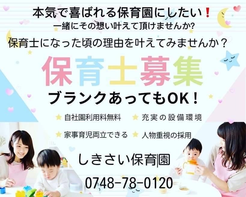 ってことで、弊社グループ企業で甲賀市甲南町にある「しきさい保育園」では現在保育士、調理師さんを大募集しております!
